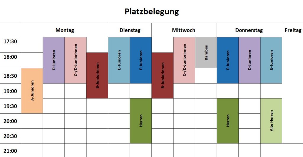 Trainingszeiten aller Mannschaften auf einen Blick.